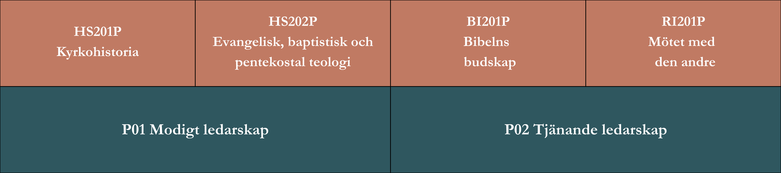 Det andra året har en extra stark betoning på att kliva in i praktik med kurser i Modigt ledarskap och Tjänande ledarskap. Under år tre och fyra kombineras tjänsteinriktade församlingsledarkurser med teologiska fördjupningskurser där du bland annat läser kurser som Förkunnande ledarskap, Pastoralt ledarskap, Hållbart ledarskap och Missionellt ledarskap. Högskolestudierna i Pastorsprogrammet omfattar en kandidatexamen i teologi.